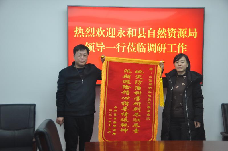 調(diào)研會后,王麗萍局長代表永和縣自然資源局向五勘院贈送了錦旗。(通訊員:譚云鵬)