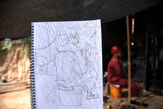 驕陽(yáng)似火,熱浪襲人。采風(fēng)第一站來(lái)到了襄汾縣李家莊金礦普查項(xiàng)目的鉆機(jī)工地,一到施工現(xiàn)場(chǎng),藝術(shù)家們就被眼前揮汗如雨的勞動(dòng)場(chǎng)面和井然有序的生產(chǎn)流程所吸引,激發(fā)了創(chuàng)作熱情,用手中的畫(huà)筆和相機(jī)記錄下鉆機(jī)工人戰(zhàn)高溫、斗酷暑,奮力拼搏、艱苦奮斗的一幕幕場(chǎng)景。