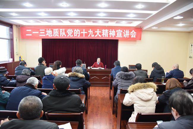 12月19日下午,二一三隊在二樓大會議室舉辦黨的十九大精神專題講座,特邀臨汾市堯都區(qū)委宣傳部副部長、區(qū)委宣講團成員秦英進行專題宣講。隊領(lǐng)導、黨員干部、職工共50余人參加講座,宣講會由隊黨委副書記趙江濤主持。